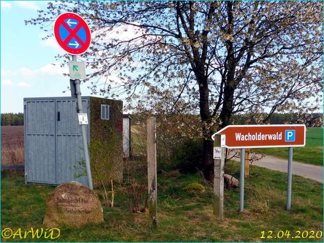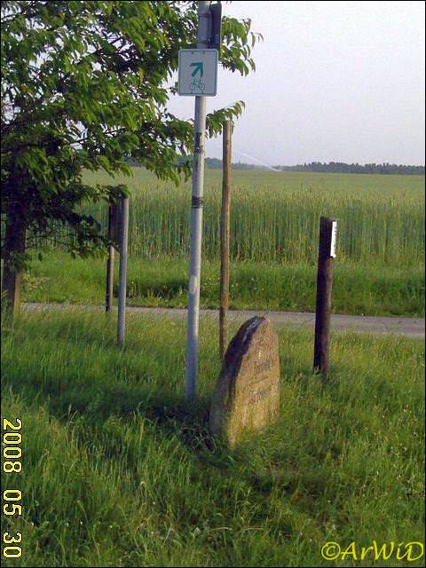 Das ersten beiden Fotos zeigen die Stelle Ende Mai 2008 mit dem Blechschild mit der entsprechenden Ortsangaben am Holzpflahl sowie den daneben stehnden gravierten Stein, leider habe ich kein besseres Foto vom Blechschild aus dem Jahre 2008.