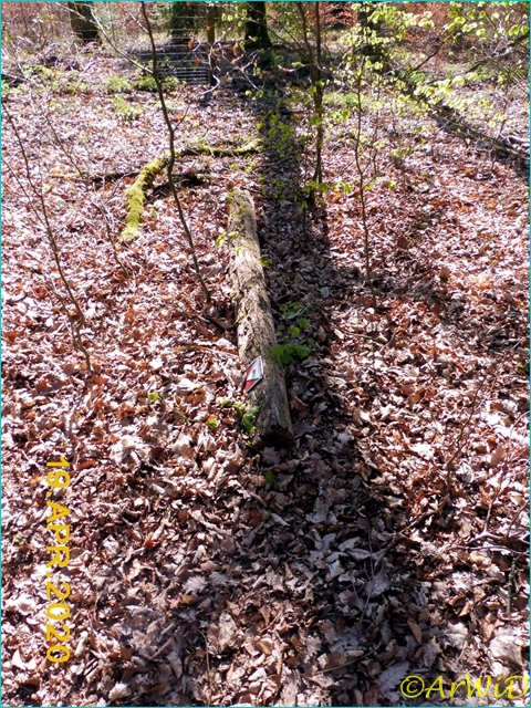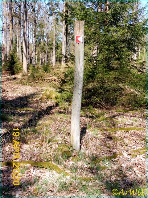 Der erste Wegweiser auf der lange Runde ist an einen Pfahl befestigt der abgebrochen an der Kreuzung auf der Position 32 U 590614 5854634 liegt.