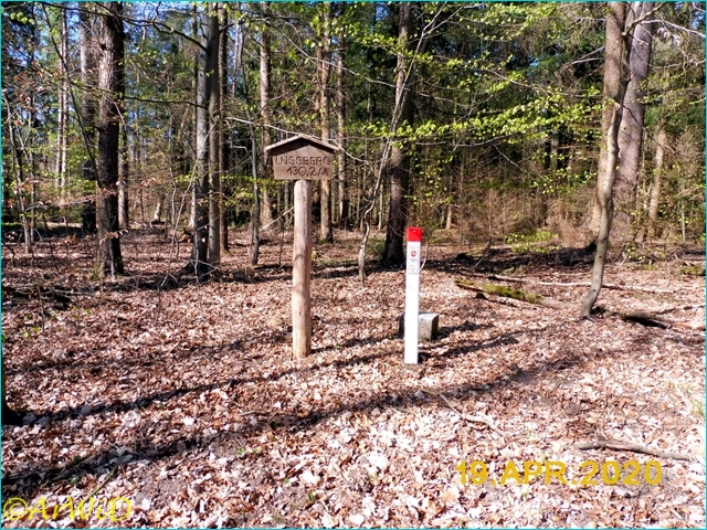 Als erstes möchte ich euch das hölzerne Gipfelschild mit dazugehörigen Vermessungsstein auf der Position 32 U 590427 5854698 am ehemaligen langen Rundwanderweg 4*.