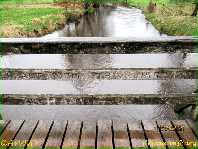 Gemäß der Gravur im Geländer wurde diese Brücke im Jahre 1992 (… siehe auch https://ov-soltau.thw.de/unser-ortsverband/chronik/…) durch das THW Ortsverband Soltau erstellt.