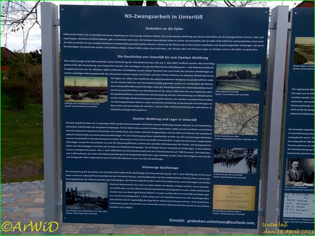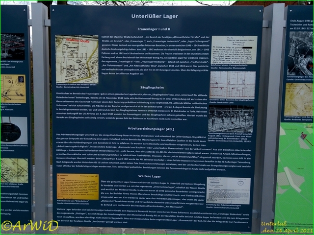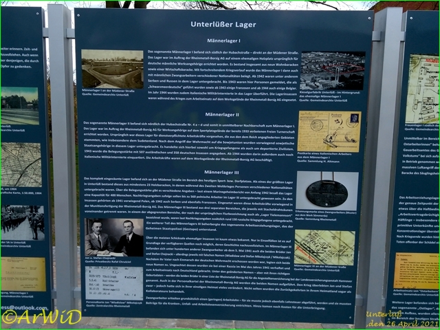 An dieser Gedenkstätte, die aus vier Infotafel besteht wird der Geschichte des 2. Weltkrieges aber auch im Besonderen den Insassen der örtlichen Männer- , Frauen- und Arbeitserziehungslager gedacht. Zusätzlich wird hier auch dem Außenlager Tannenberg des Aufnahmelagers KZ Bergen-Belsen , sowie anderen betrieblichen Lagern in der und bei Unterlüß erinnert.