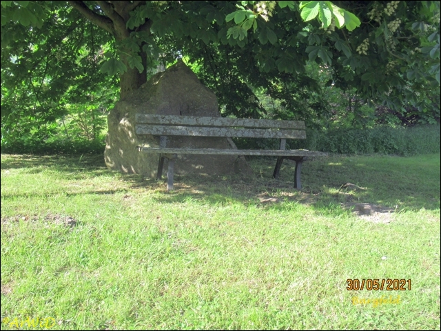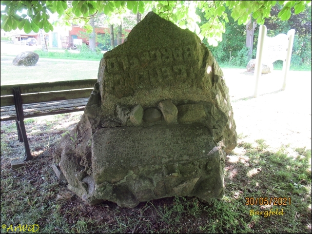 Es handelt sich hierbei um den umgefallen bzw. umgestürzten Gedenkstein unter einen Busch auf der Position 32 U 591217 5839846 im Verlauf der Straße „Im Luttertal“ am Abzweig „Im Beckfeld“ mit einer Bank davor.