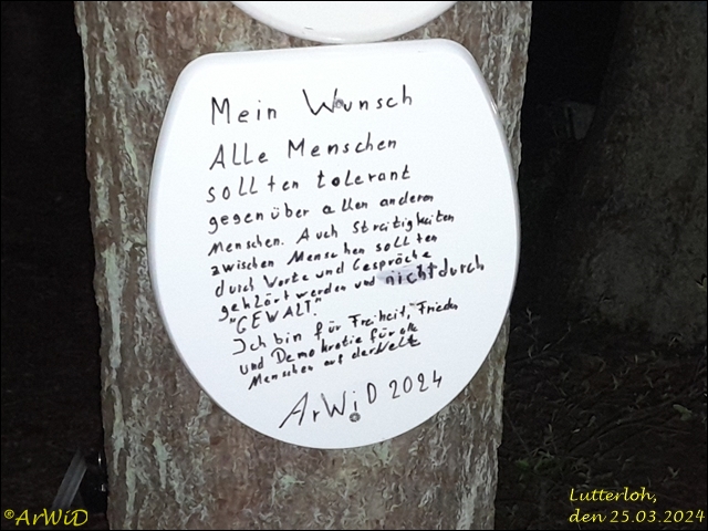 Vor kurzen habe ich nun ein weiteres Schild angebracht, welches ich nun Aufgrund eines inhaltliches Fehler am Montag den 25.03.2024 noch ein korrigiert habe, welche meine Wünsche für die Zukunft aller Menschen auf der Welt darstellt und welche zur Zeit scheinbar in der Welt nicht möglich bzw. erwünscht sind.