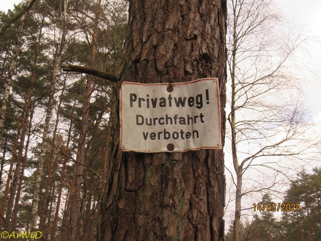 Anschließend noch die Zufahrtsbeschilderung für einen gut ausgebauten mit einer hölzernen Schranke beschrankter Weg der für Reiter verboten und zusätzlich noch mit der Warnung der Videoüberwachung beschildert ist.