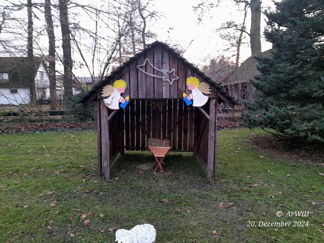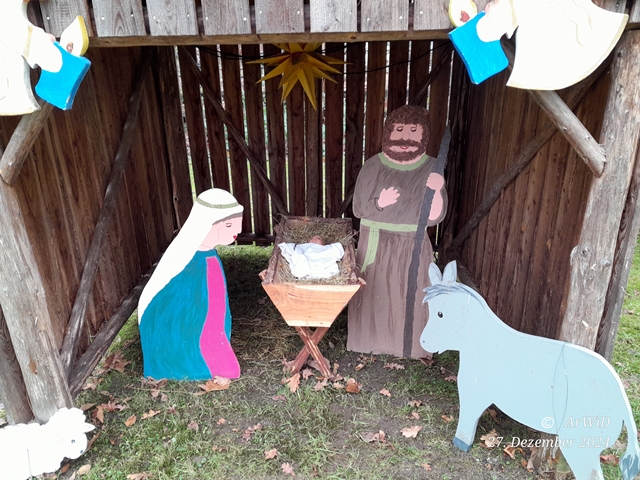 Weiterhin habe ich erfahren das die Krippe immer auf Wünsch der örtlichen Kinder zum 1.Advent aufgebaut wird und erst am 24.Dezmeber dort eine geliehene Puppe als Dummy für das Christuskind rein gelegt wird. In den letzten Jahren gab er keine Probleme mit Vandalismus oder Diebstahl.