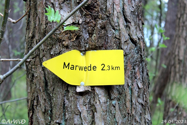 Etwas neben dem Schutzhütte am Stromkasten befindet sich auch noch an einen Baum am Waldrand noch ein Wegweiser in Richtung Marwede.