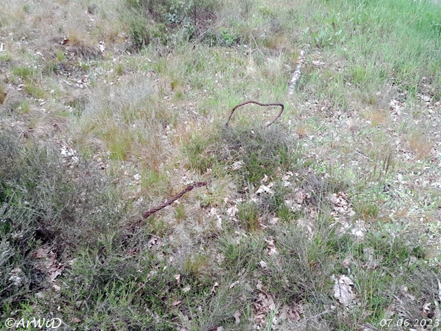 Es handelt sich hierbei um ein ins Gras und Wildkräuter eigewachsenes Stahlseil am Rande der dortigen Heidefläche, das je nach Jahreszeit auch schon mal aus den Auge verschwinden kann.