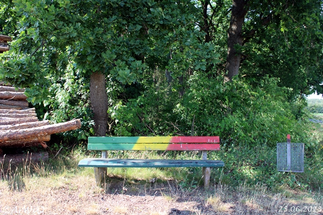 Zum ersten handelt es sich um die bunte Bank auf dern UTM-Koordinaten 32 U 574676 5860474 am Hang des 83-Meter hohen Eitzberg mit einigen Gravuren.