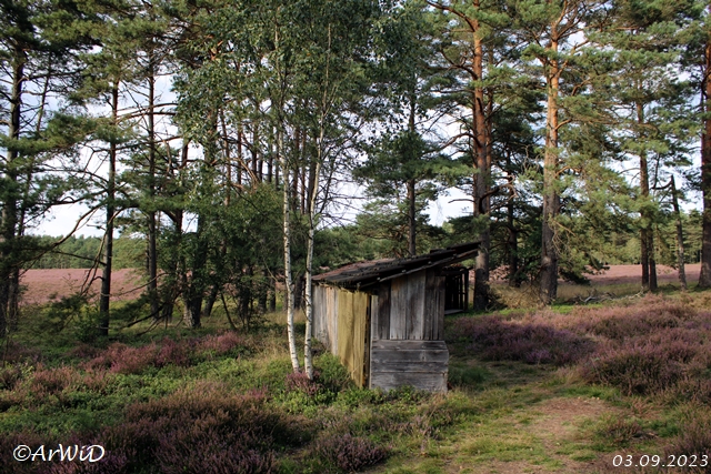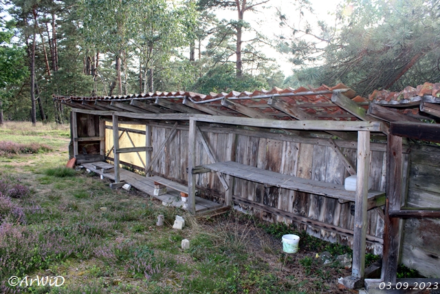 Hierbei habe ich auch den leeren Bienenunterstand auf den UTM-Koordinaten 32 U 577936 5850784 am Rande der Heidefläche und am Rundweg vom Wanderparkplatz Eiksberg besucht.
