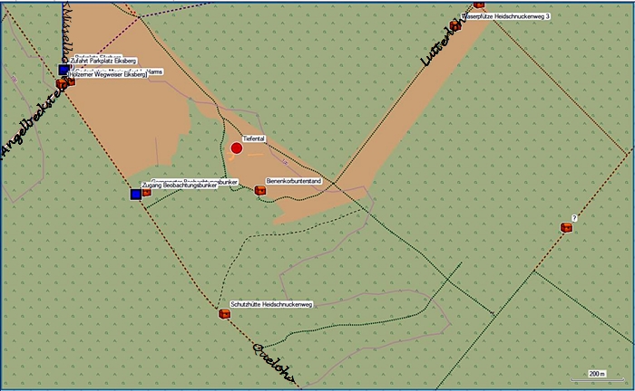 Etwas weiter am Rande der Fläche und am Weg vom Wanderparkplatz Eiksberg in Richtung Queloh befinden sich noch Überreste des gesprengten Beobachtungsbunker in den kleinen Wäldchen.