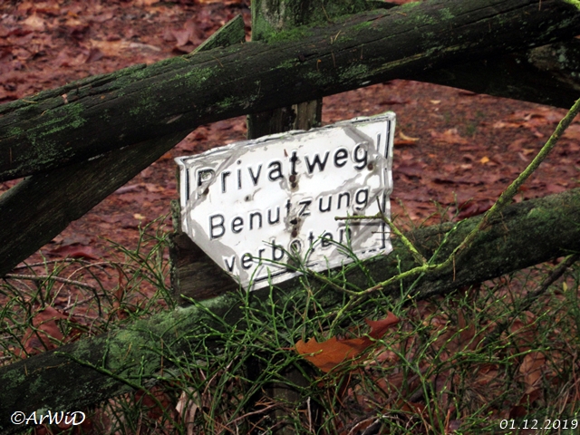 Zum einen die hölzerne Pforte mit Privatwegschild auf den UTM-Koordinaten 32 U 580513 5852362 an einen kleinen Stichweg.