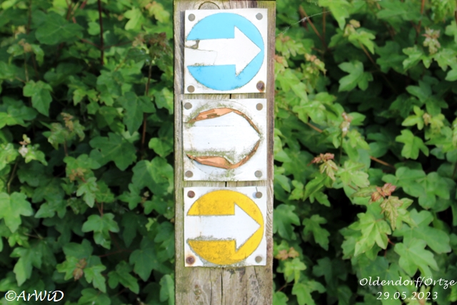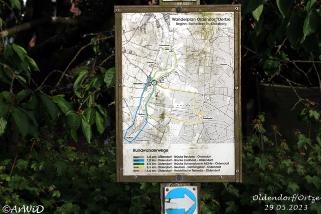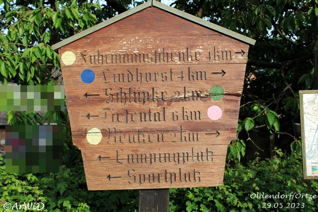 Auf den einzelnen Schilder und Tafel sind alle Wege in die nähsten Nachbarorte mit farblich Kennzeichnungen Rund um Oldendorfab und werden dort mit ihen Verlauf abgebildet.