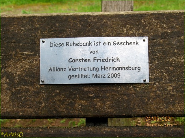Gemäß aufgebrachten Schild wurde diese Bank von der Allianz Vertretung Carsten Friedrich aus Hermannsburg im März 2009.