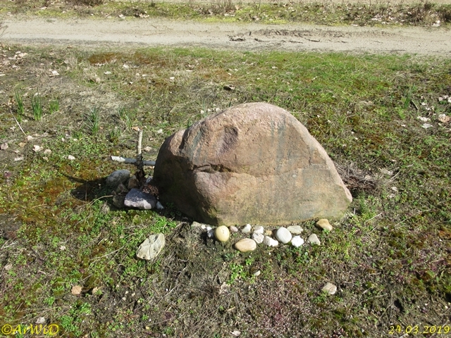 Das ersten beiden Fotos zeigen die Stelle Ende Mai 2008 mit dem Blechschild mit der entsprechenden Ortsangaben am Holzpflahl sowie den daneben stehnden gravierten Stein, leider habe ich kein besseres Foto vom Blechschild aus dem Jahre 2008.