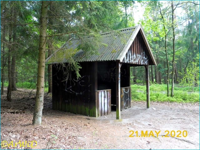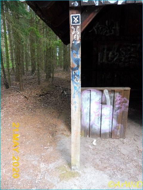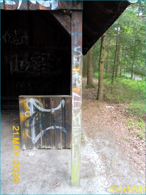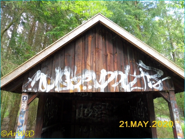 Dieses Objekt hat bei mir den Namen „Galerie im Wald“ wegen der vielen Graffitis an und in der Schutzhütte bekommen.