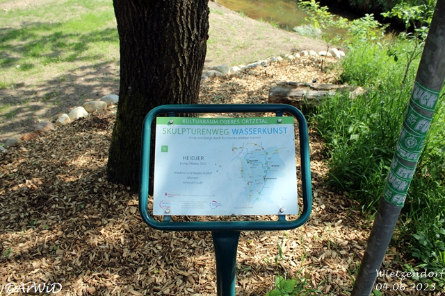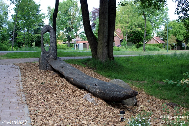 Das Objekt aus dem Jahre 2012 aus Eiche und Ölfarbe wurde von den Künstlern Wladimir und Natalia Rudolf aus Munster erstellt und gehört zum Skulpturenweg Wasserkunst an der Örtze und Wietze hier vor Ort.