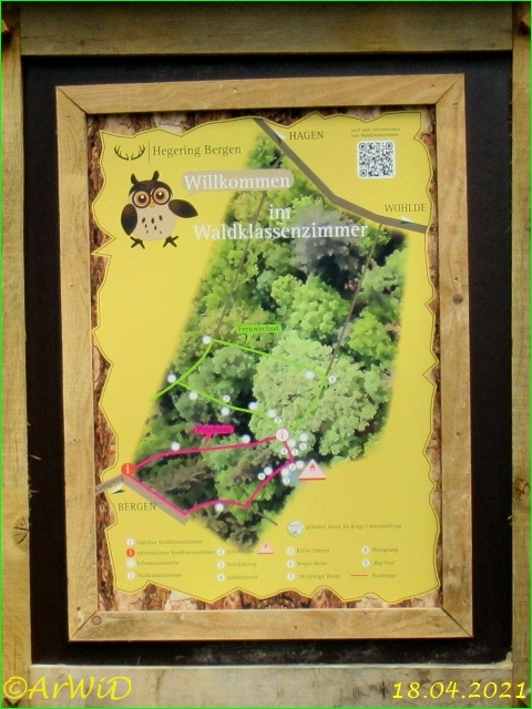Es handelt sich hierbei um das Waldklassenzimmer auf der Position 32 U 566729 5852438 mit der dazugehörigen im Juni und Juli 2020 instandgesetzte pyramidenförmigen Schutzhütte auf der Position 32 U 566731 5852429 des Hegeringes Bergen.