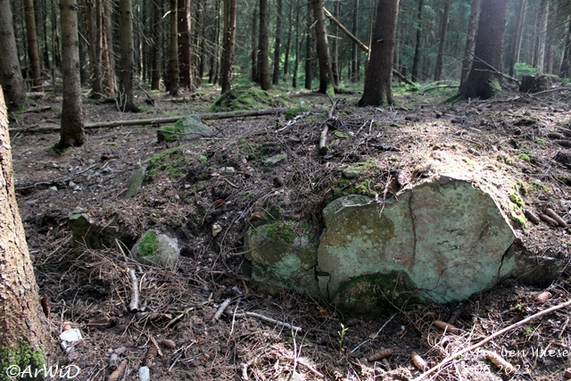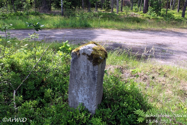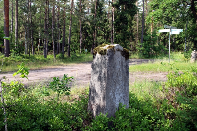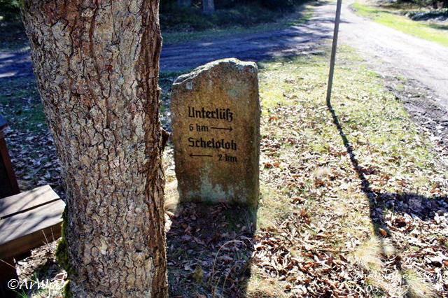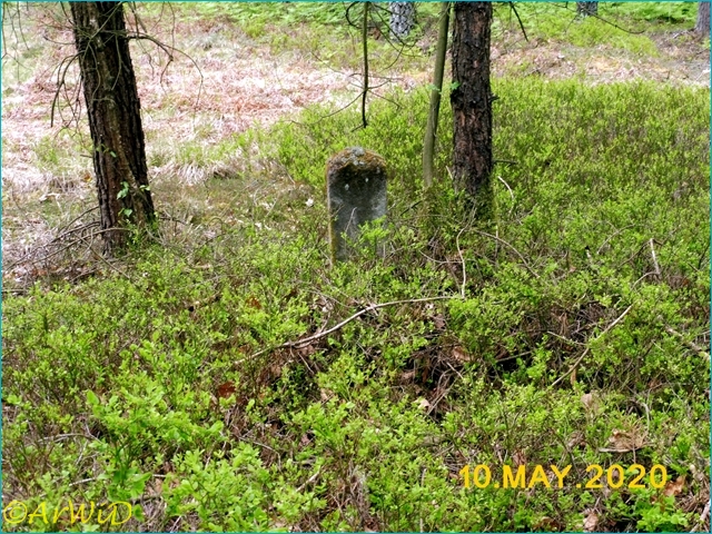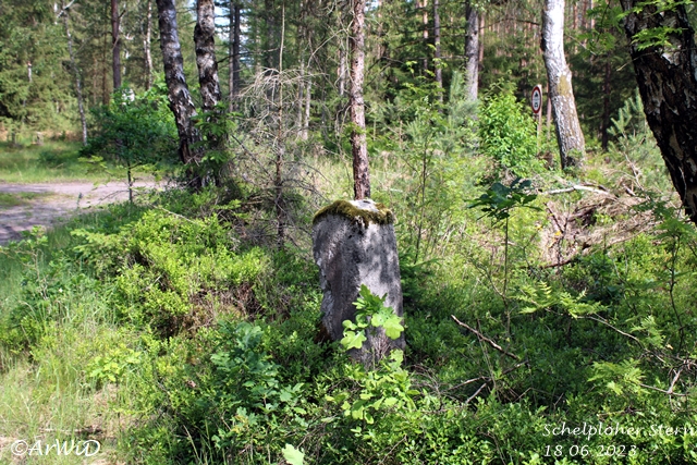 Aus diesen Grund steht neben des Radwanderwegweisers des ADFC auf der Hauptkreuzung, dem steinener Wegweiser am Rastpaltz auch noch am Rande des Kreuzung im Waldrand die zum Jadgschloss gehörende nicht mehr lesbare Stele auf den UTM-Koordinaten 32 U 589704 5850303.