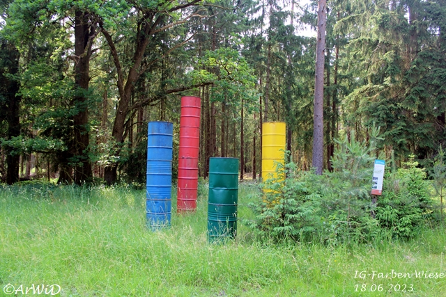 Als erstes gibt es dort die Skulptur Farbfässer der Lehrte stammenden Künstlerin Hildegard Mohn auf den UTM-Koordinaten 32 U 591081 5848614, die wie der Name schon sagt aus aufgestappelten Fässern in Blau, Rot, Gelb und Grün.
