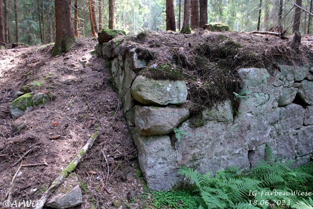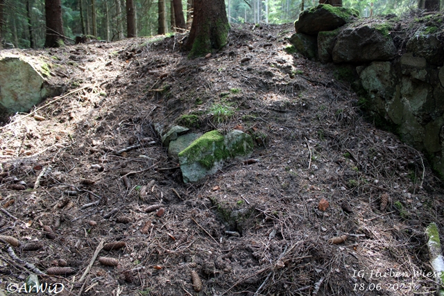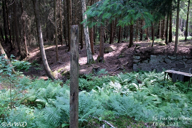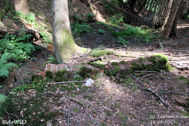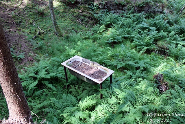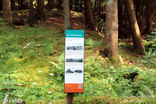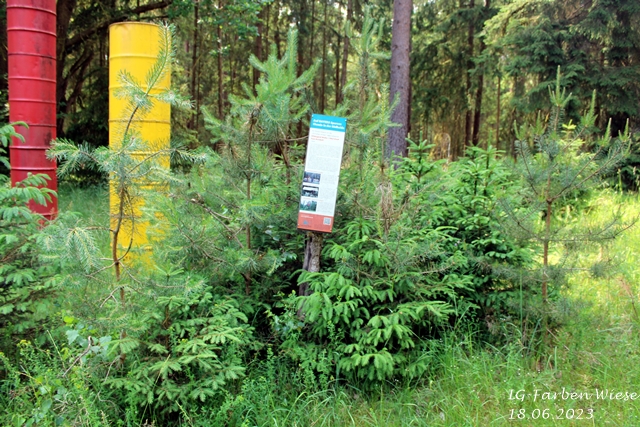 Bei meinen Besuch im März 2025 habe ich festgestellt, das sich im Bereich des alten Fabrikfundamentes einiges positives getan hat aber jetzt die Infotafel bei den Farbfässer nur lose gasteht und die Skulptur abgebrochen am Boden liegt.