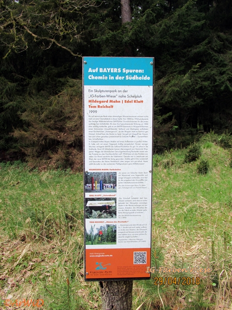 Zusätzlich sind in meinen Blog https://ruhlerhof.de/2025/08/01/farbfasser-und-damon-des-gestanks-2008-und-2012/ sind Fotos von den beiden anderen Skulpturen „Farbfässer“ von der Lehrter Künstlerin Hildegard Mohn sowie dem „Dämon des Gestanks“ vom 2004 verstorbenen Künstler Tom Reichelt zu sehen, die auch noch zu den Skulpturen an der IG-Farben Wiese gehören.