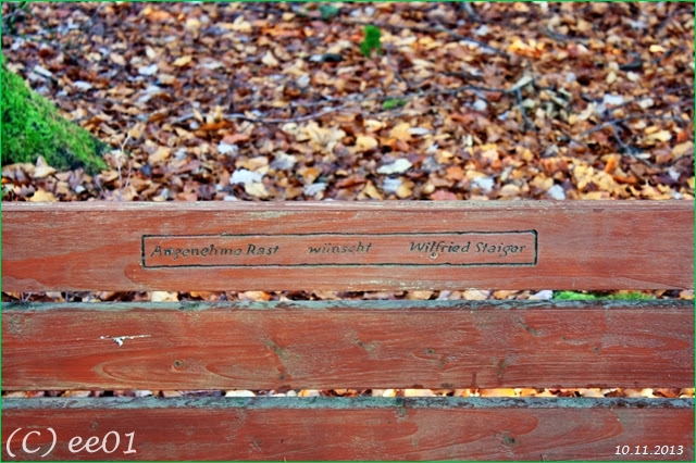 Als erstes möchte ich die Bank mit dem Schriftzug „Juli 2007 (Raute) Wilfried Staiger“ auf der Position 32 U 583281 5854097 am Waldrand, welche ich jedes Jahr immer erst bei zweiten oder dritten Anlauf „finde“.Der Grund dafür ist ,das ich diese Bank zuerst immer direkt an der nächsten Kreuzung suche. Aufgrund des abgefallenen unteren Brett an der Rückenlagen ist diese Bank zur Zeit leider immer noch leicht reparaturbedürftig.